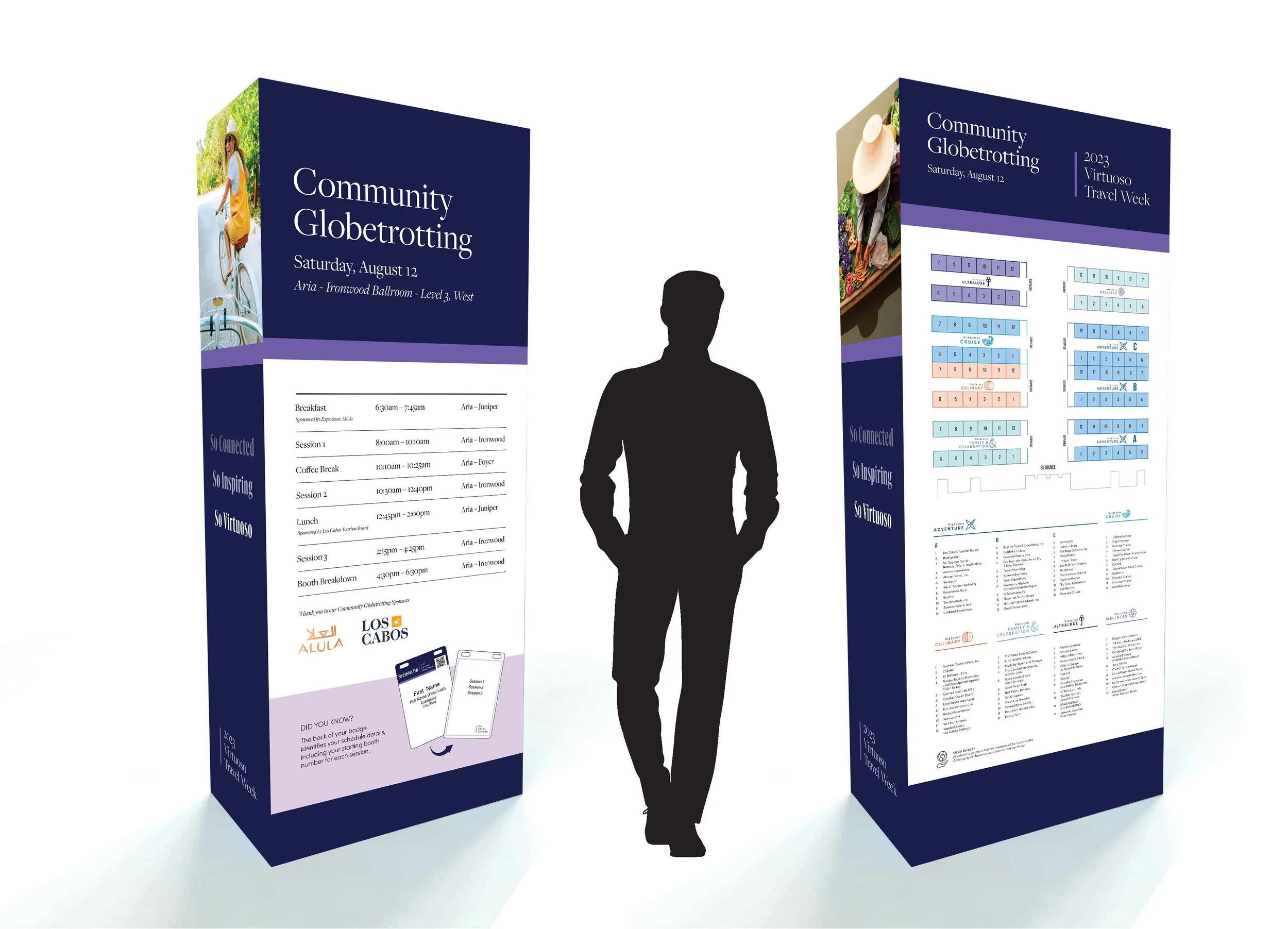 Each year, Virtuoso hosts a conference, Travel Week, that brings together travel professionals from around the world. For the 2023 event, I was responsible for designing a diverse range of graphics to be featured throughout the conference. This included everything from menus and small signage to large wall graphics and directory towers. The project required an eye for detail and an understanding of the conference’s previously established visual identity, ensuring that each graphic element was not only cohesive with the overall theme but also effectively optimized for large-scale spaces.
